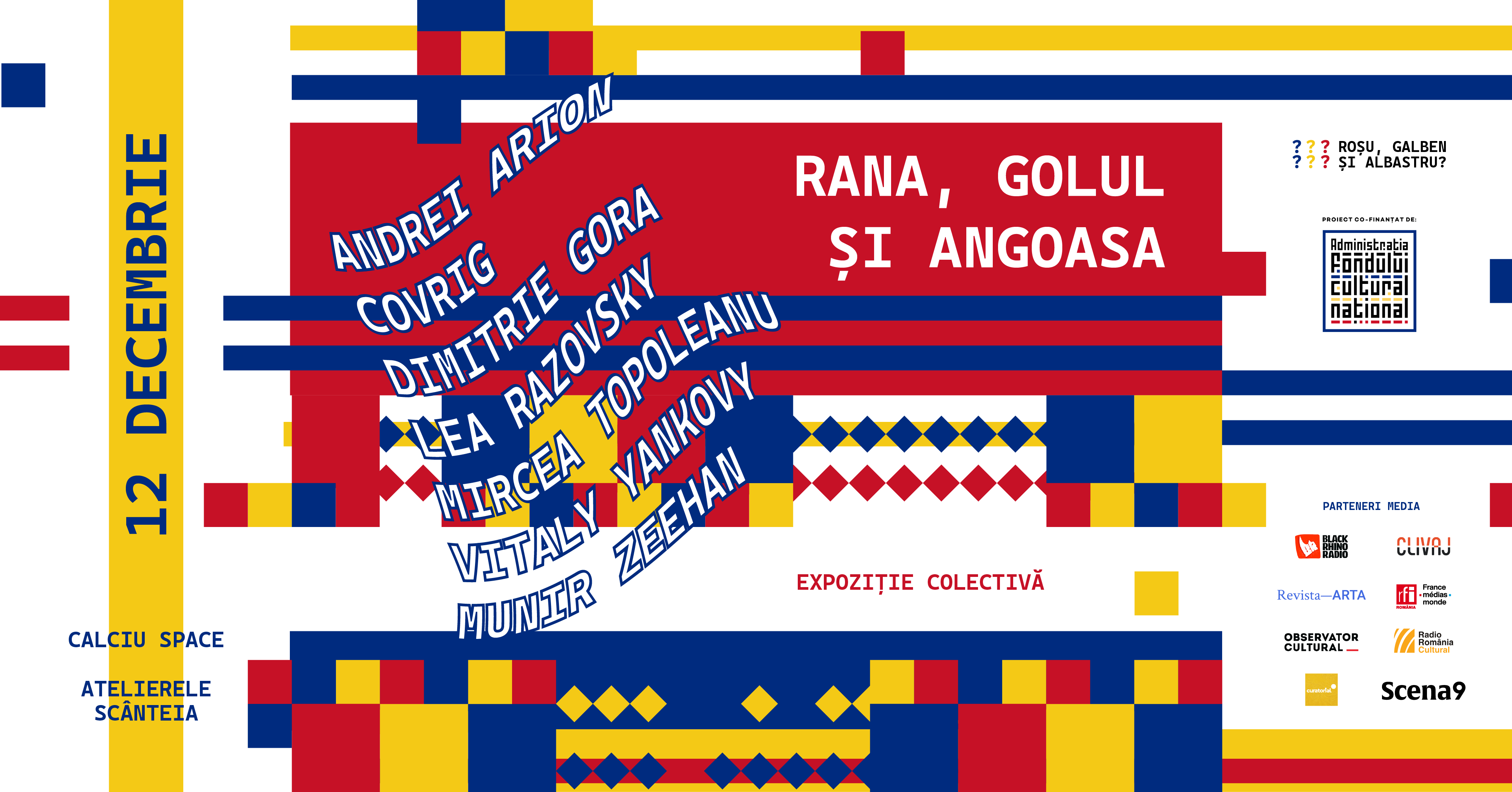 Pe 12 decembrie, între orele 18:00 și 22:00, Calciu Space găzduiește vernisajul expoziției colective „Rana, Golul și Angoasa”, parte din proiectul cultural „Roșu, Galben și Albastru?”, o inițiativă colaborativă care chestionează simbolurile naționale, reprezentările identitare și granițele vizibile și invizibile ale apartenenței în România contemporană.