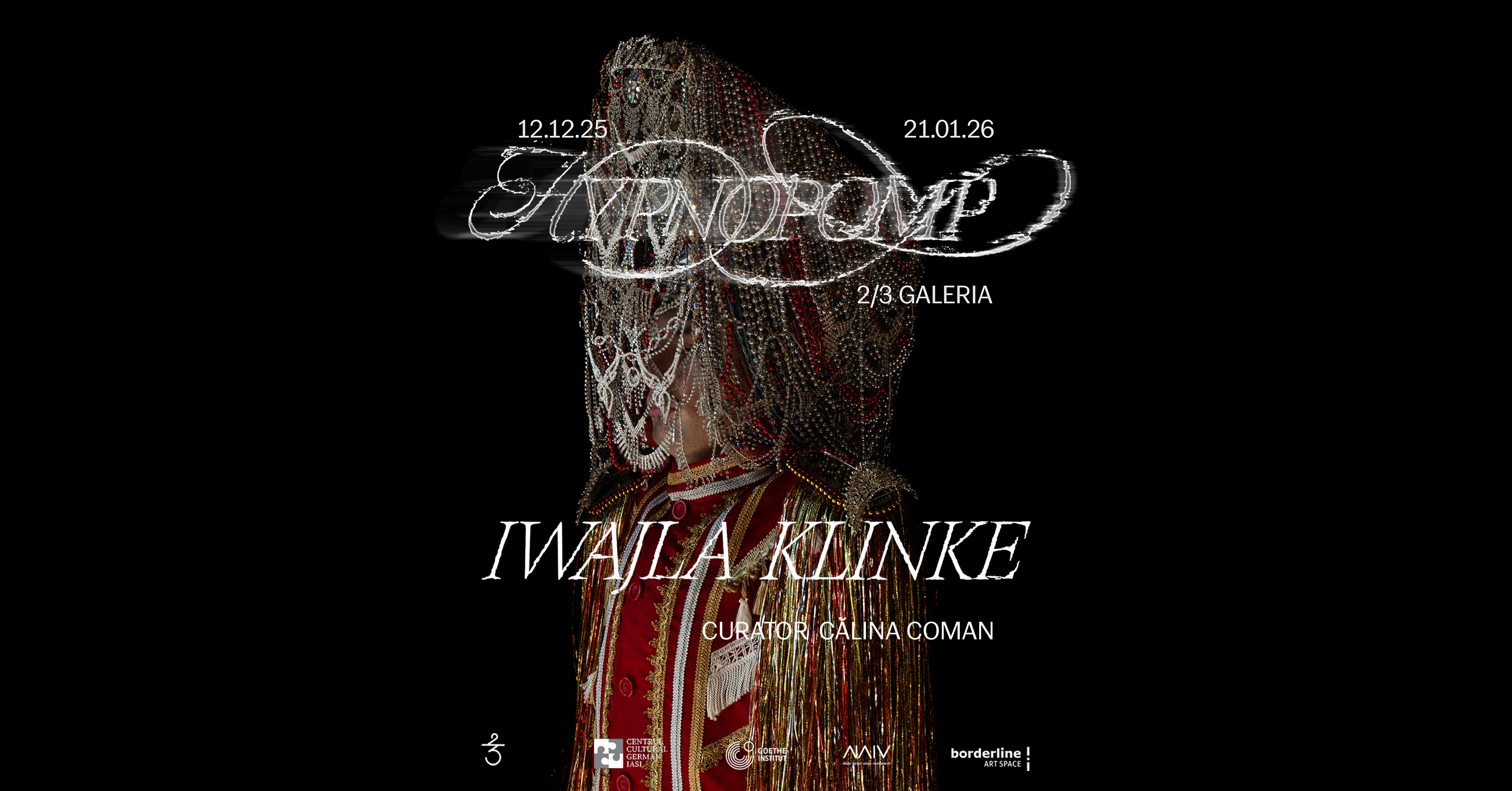 Vineri, 12 decembrie, de la ora 18.00 la 2/3 galeria are loc deschiderea expoziției de fotografie a artistei germane Iwajla Klinke, în prezența autoarei. Intitulată „HYPNOPOMP” expoziția este curatoriată de Călina Coman, aceasta va rămâne deschisă publicului până pe 21 ianuarie 2026, la 2/3 galeria (Strada Franceză nr. 4), în intervalul joi-vineri (14-19), sâmbătă-duminică (12-17).