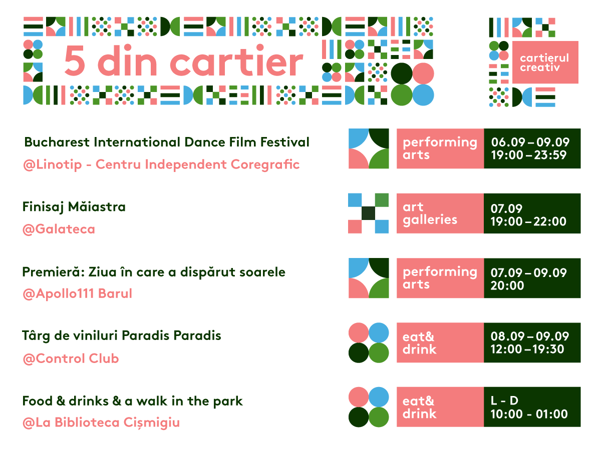 Vacation over! Am revenit cu recomandările săptămânale de 5 din cartier. Ce-i de făcut, văzut, ascultat, încercat în Cartierul Creativ, în săptămâna 3-9 septembrie: